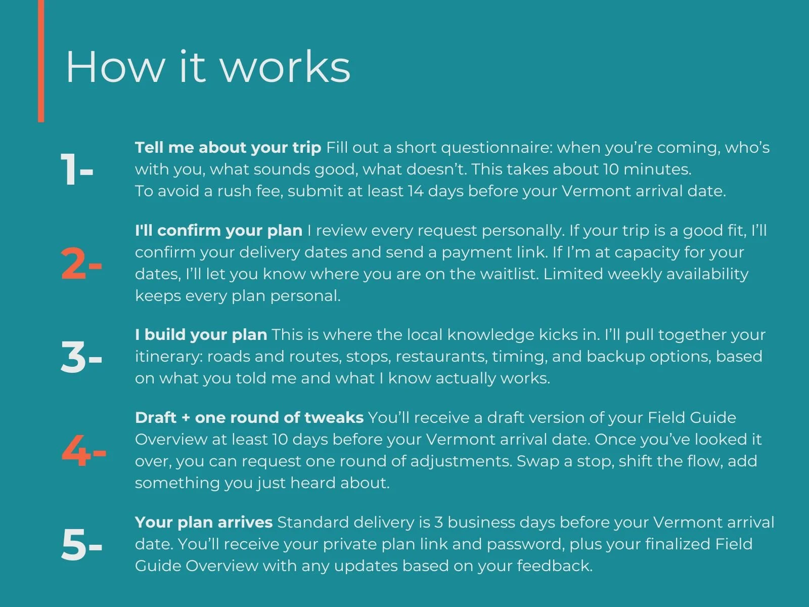 Plans cover up to three days. Staying longer? We can add a guided tour day, where I get behind the wheel and you just enjoy Vermont unfolding out the window.
