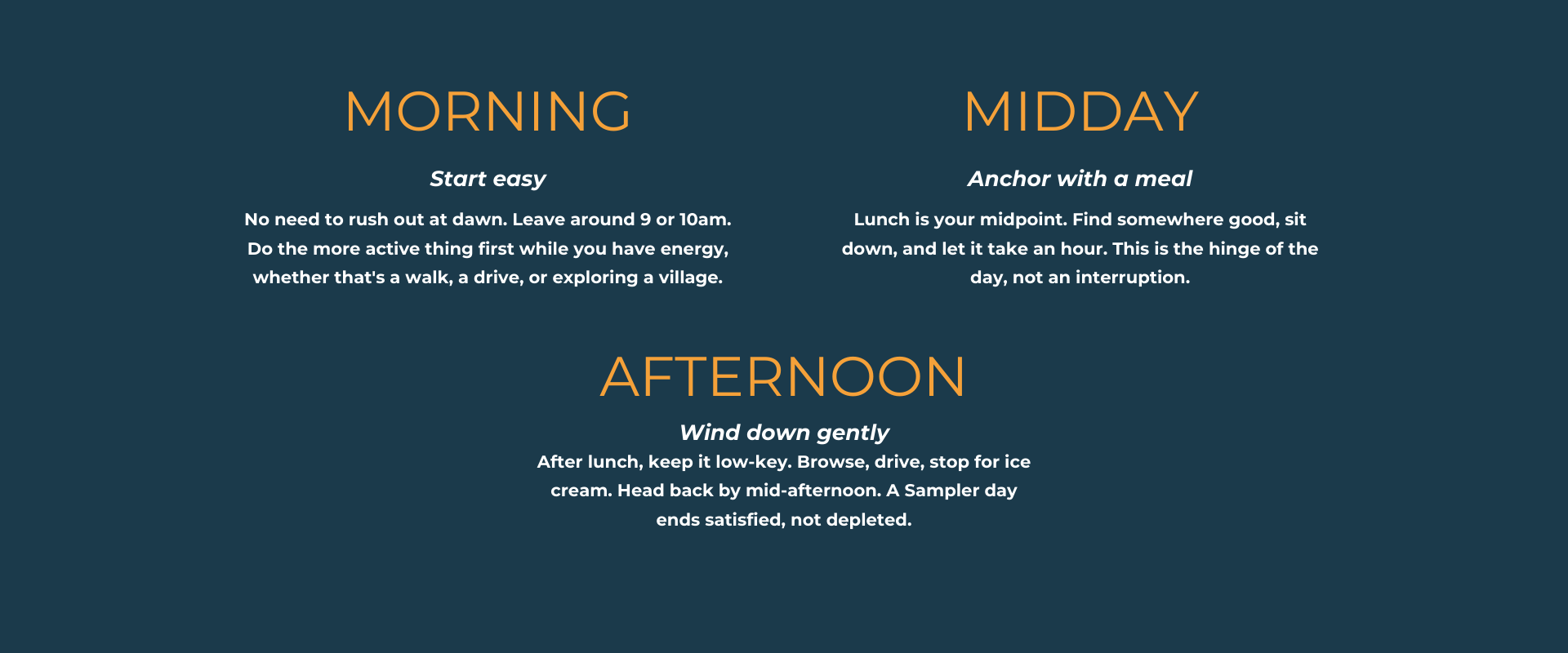 That means you're not optimizing for variety. You're optimizing for flow. A great Sampler day feels unhurried even though you did several things. The transitions are smooth, the pacing is gentle, and you never feel like you're racing to the next stop.