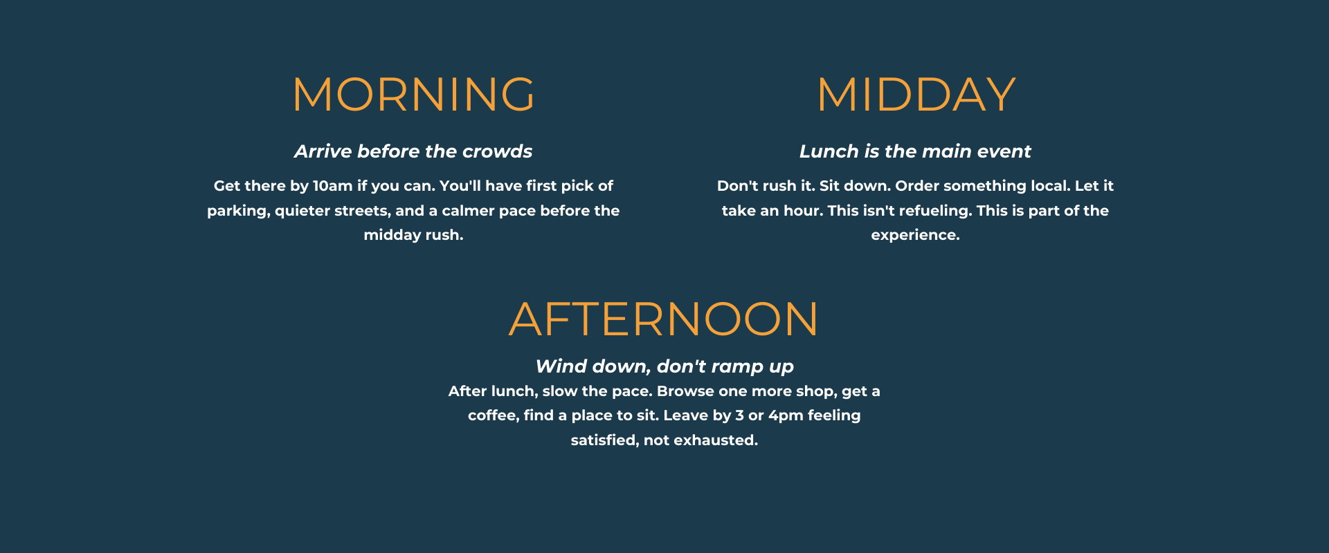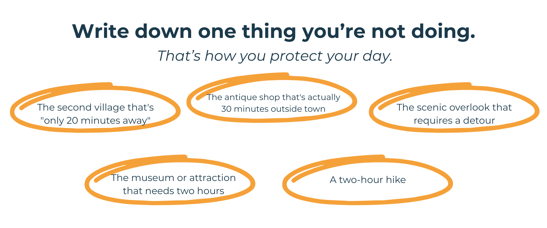 A Villager day needs slack. If you've scheduled a shop visit, a museum, a tasting, and two meals, you're sightseeing, not savoring.